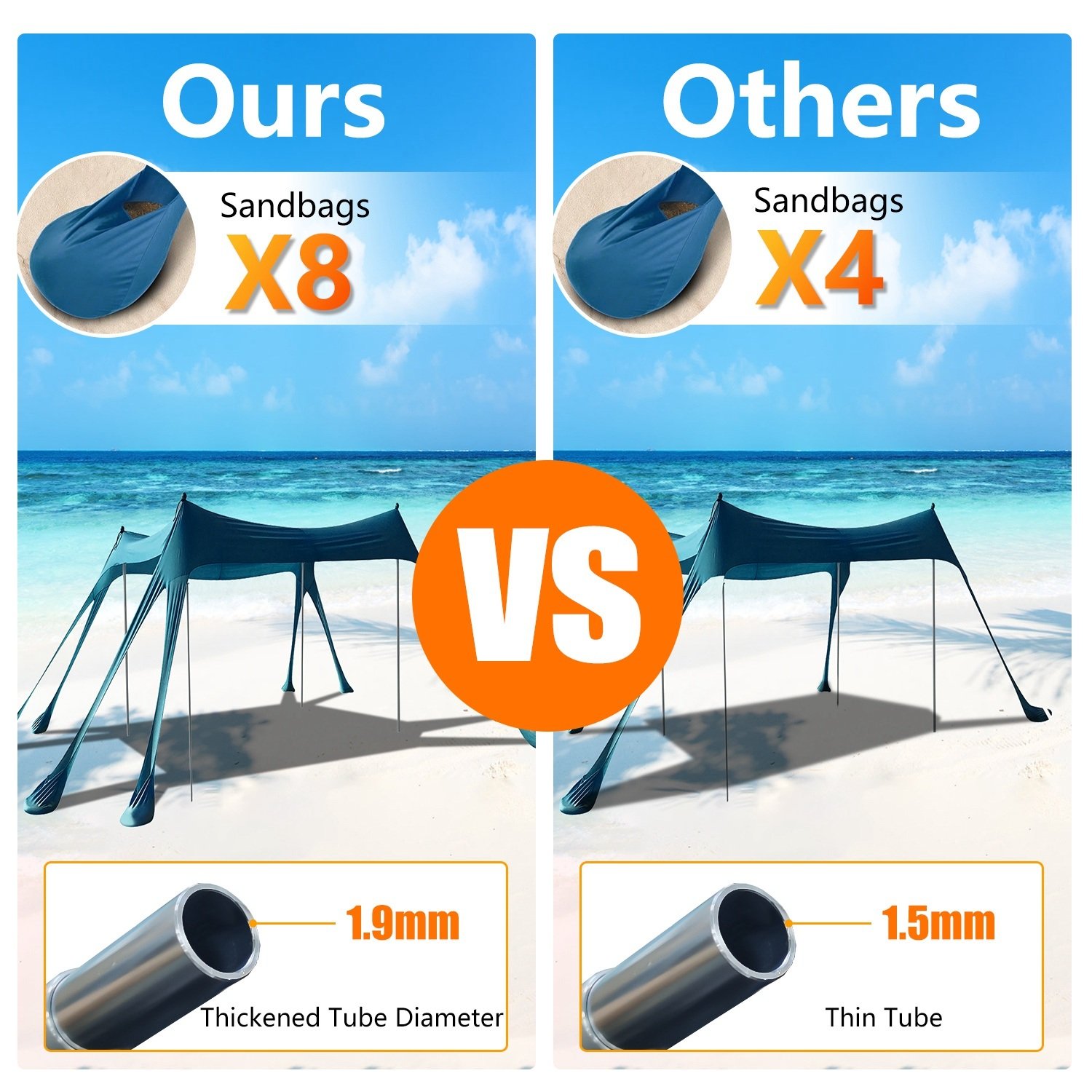 *Quick Setup & Portable*:Unfold the beach tent,fill sandbags and use aluminum poles to prop the tent. You can quickly set up this shade sail within few minutes. Also come with a carrying bag to neatly organize all the accessories for convenient transport on the go.