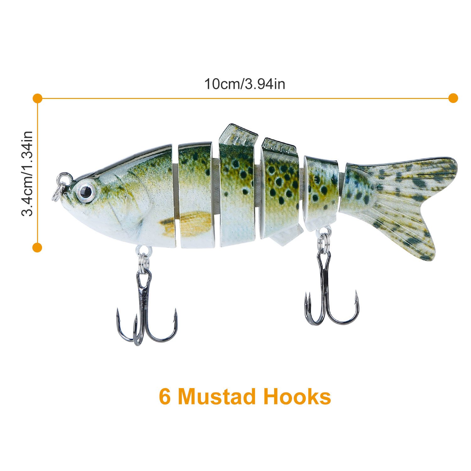 ** 6 Segment Fish Lures*:Designed with 6 segment multi-jointed body,the fishing lure kit can moves flexibly in water. Its life-like swimming action can attract more catches and strike from provoking predator fishes.