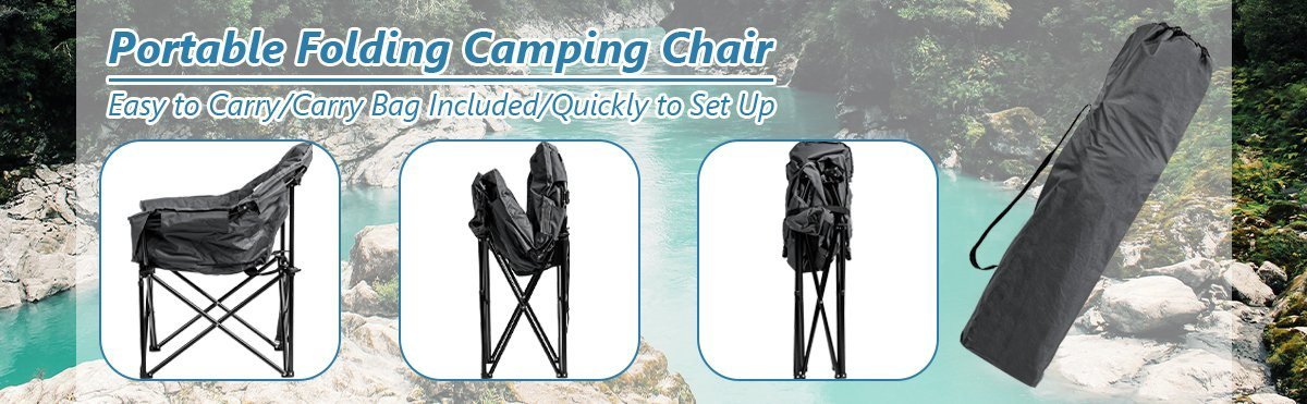 Breathable oxford fabric and soft cotton inside for comfortable sittingDurable and stable steel frame for long lifespanLarge bearing capacity of 300 lbsErgonomic backrest and oversized seat can well support your bodySide cup holder with mesh bottom for extra storage spaceLightweight and portable design for easy transportationFolding design for easy storage; saving spacePerfect for camping; fishing; garden; lawn and deckNo assembly needed