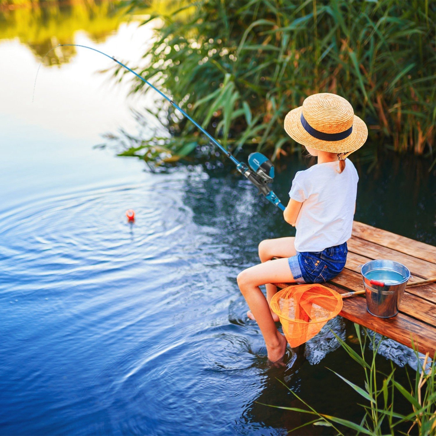 *Kids Fishing Pole Set*:This kids fishing starter kit includes 1 telescopic fishing pole,1 spincast reel and 1 backup fishing line and 1 tackle box with 56Pcs lures suited to different fishing situations. Blue and pink are available. An ideal fishing gear for boys or girls aged 5+years old.
