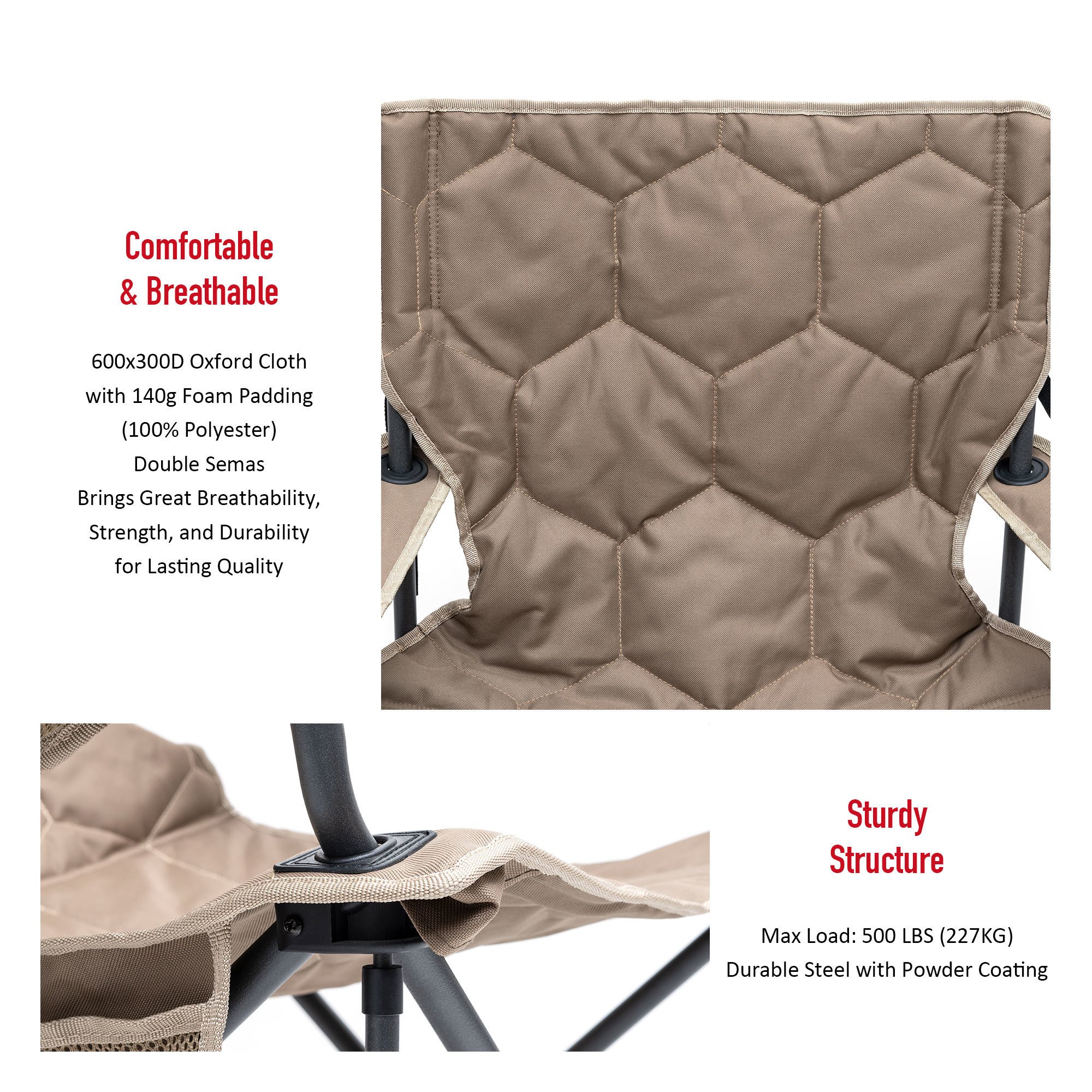 Super Handy: COOLER BAG & CUP HOLDER Keep your beverages cool in this built-in cooler bag(3 cans of cokes capacity). A convenient cup holder is built in to the left arm. The fabric is made from a durable outdoor-quality 600D oxford polyester.Built to Last: The sturdy steel frame construction affords up to 300 LBS (136KG) weight capacity and the chair weights 8.8 LBS (4KG). The double-seam 600x300D Oxford Cloth with 140g Foam Padding has great strength, durability, and breathability. You don't have to worry for the heavy-duty use, either to buy a new one in the near future.