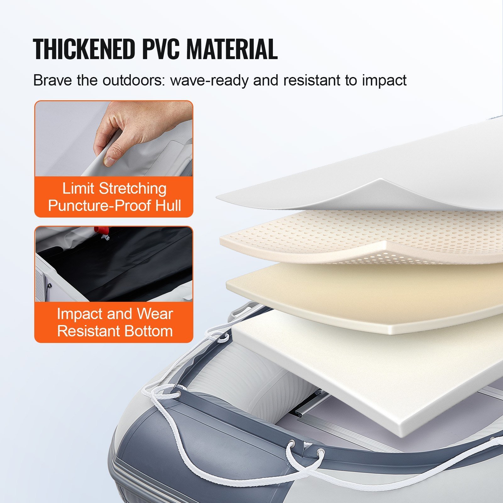 4.Robust Construction: Constructed with thick PVC for superior tensile strength and puncture resistance, this inflatable dinghy boat is sea-ready and equipped to handle waves, sand impact, and seawater erosion. The upgraded design includes 4 independent air chambers for added safety, ensuring that damage to one doesn't compromise the boat's buoyancy.